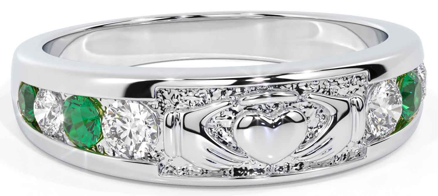 Este anillo Claddagh viene en conjunto de oro y plata con una selección de diamantes y piedras preciosas. La selección actual se hace a partir de 10K . Set with Esmeralda Sintética Diamantes sintéticos. Ancho máximo del anillo 5 mm.